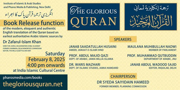 The launch ceremony of the Quran translation will be presided over by Dr. Syeda Syedain Hameed, former member of the Planning Commission of India. The speakers at the event will include Janab Syed Sadatullah Husaini (Ameer, Jamaat-e-Islami Hind), Maulana Mohibullah Nadwi (Member of Parliament), Professor Abdul Majid Qazi (Department of Arabic, Jamia Millia Islamia), Professor Muhammad Qutbuddin (Department of Arabic, JNU), Dr. Waris Mazhari (Department of Islamic Studies, Jamia Hamdard) and Mr. Abdul Wadood Sajid (Editor, Inquilab, Delhi).